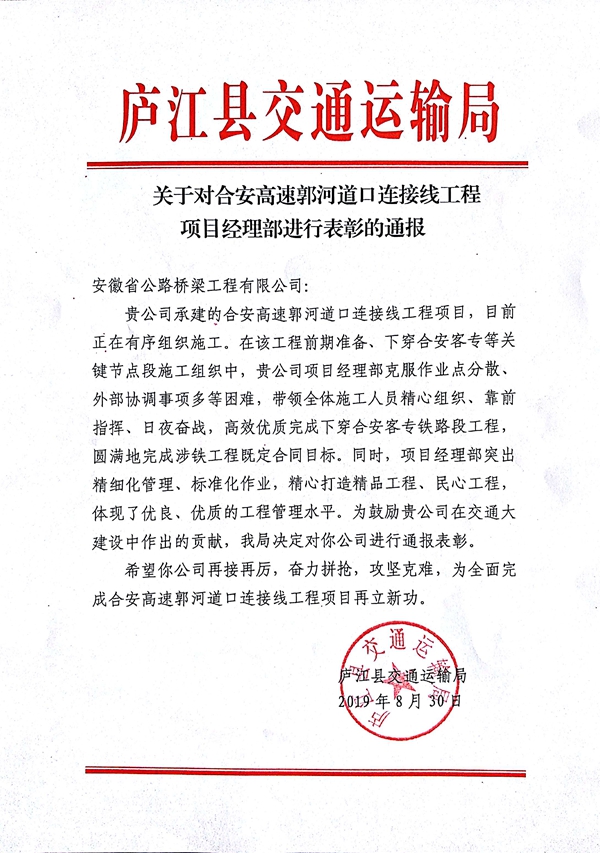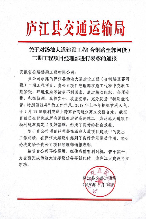 近日,廬江縣交通運(yùn)輸局發(fā)文對(duì)湯池大道二期、郭柯路兩項(xiàng)目進(jìn)行通報(bào)表彰,高度肯定了項(xiàng)目團(tuán)隊(duì)管理水平及工程形象進(jìn)度等工作。
