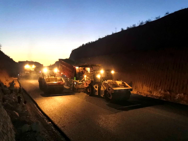 項目全長34.6公里,途徑四個鄉(xiāng)鎮(zhèn),在完成路基施工后,根據(jù)交驗時間分段進(jìn)入路面攤鋪。立足實際情況,項目充分發(fā)揮主觀能動性,尋找一切可利用的工作面,精心策劃、見縫插針組織路面施工。在率先完成一工區(qū)水穩(wěn)、瀝青攤鋪施工任務(wù)后,迅速組織精干力量,轉(zhuǎn)戰(zhàn)一二工區(qū)連接部分?jǐn)備伿┕ぃ瑑H用20余天打通了兩個工區(qū)的運輸通道。