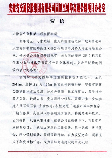 固蚌高速2標(biāo)項(xiàng)目收到業(yè)主賀信
