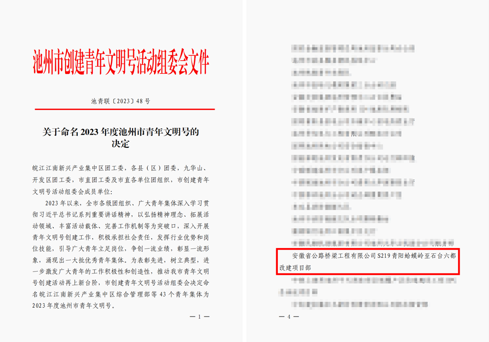 12月7日,池州市青年文明號風(fēng)采展示暨授牌儀式成功舉辦,現(xiàn)場公布了獲評2023年度池州市青年文明號名單,公司承建的S219青陽改建工程項目喜獲殊榮。