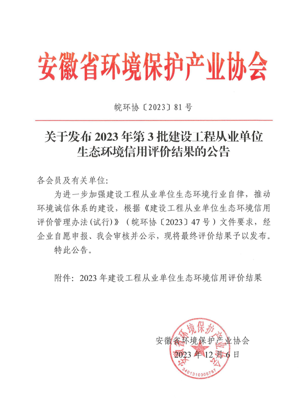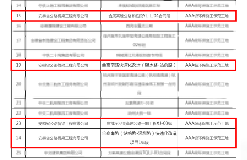 12月6日,安徽省環(huán)境保護(hù)產(chǎn)業(yè)協(xié)會(huì)公布了“2023年建設(shè)工程從業(yè)單位生態(tài)環(huán)境信用評價(jià)結(jié)果”,公司承建的合周高速潁臨段YL-LJ04標(biāo)項(xiàng)目、金寨南路快速化改造(望水路-站前路)、宣城至涇縣高速公路一期工程XJ-03標(biāo)、金寨南路(站前路-深圳路)快速化改造項(xiàng)目1標(biāo)段四個(gè)項(xiàng)目榮獲安徽省“AAA級(jí)環(huán)保施工示范工地”稱號(hào)。