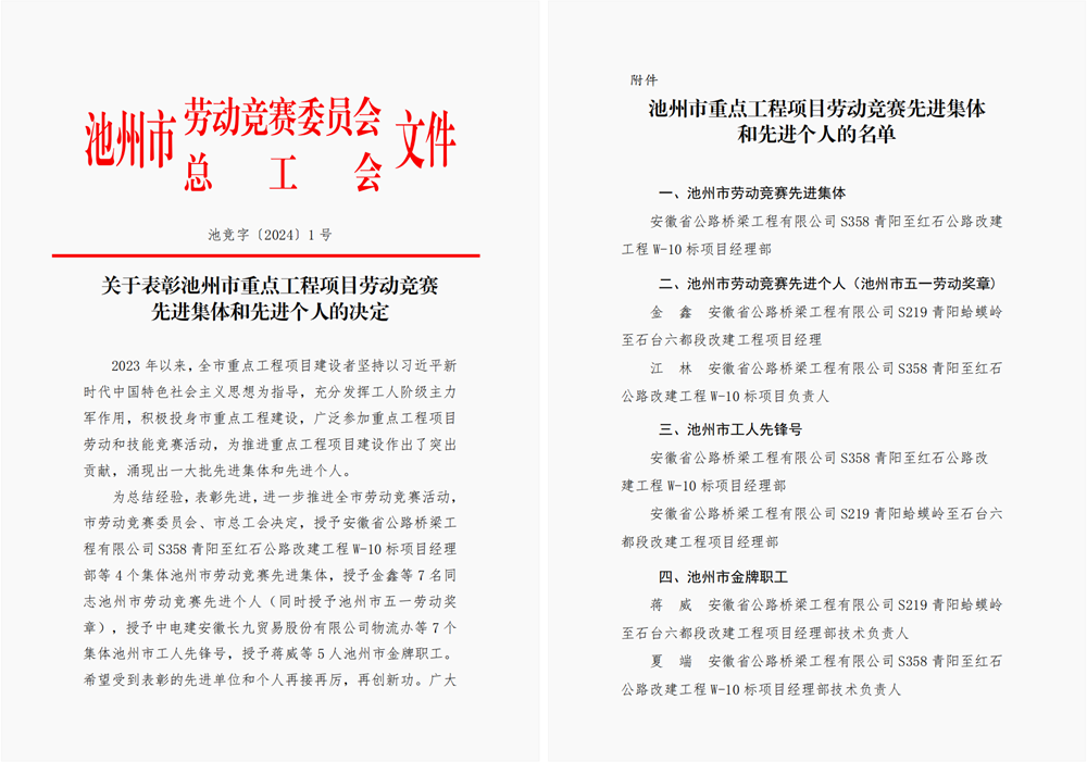 近日,池州市勞動競賽委員會、市總工會印發(fā)《關于表彰池州市重點工程項目勞動競賽先進集體和先進個人的決定》,公司所屬S358青陽至紅石公路改建工程W10標項目經理部獲評“市勞動競賽先進集體”,金鑫、江林兩名同志獲評“市勞動競賽先進個人”,同時授予池州市五一勞動獎章;S358改建W10標、S219青陽改建兩個項目獲評“市工人先鋒號”,蔣威、夏端兩名同志獲評池州市“金牌職工”。