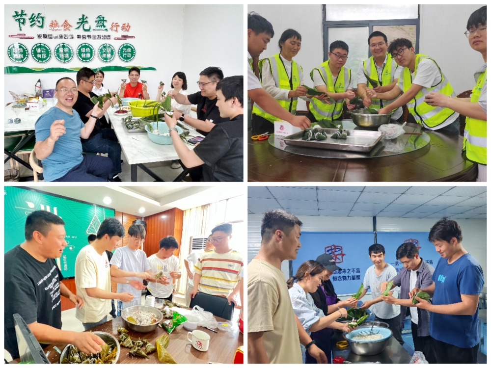 卷粽葉、放糯米、加餡料、壓緊捆扎,經(jīng)驗(yàn)豐富的同事熱情地向“新手”們傳授技巧,互相交流,項(xiàng)目員工們一起體驗(yàn)包粽子的樂趣,一個個精致飽滿的粽子在大家的手中誕生。大家各顯身手,烹飪佳肴,共享美味,隨著熱騰騰的粽子“清新”登場,一時間香氣四溢,其樂融融。