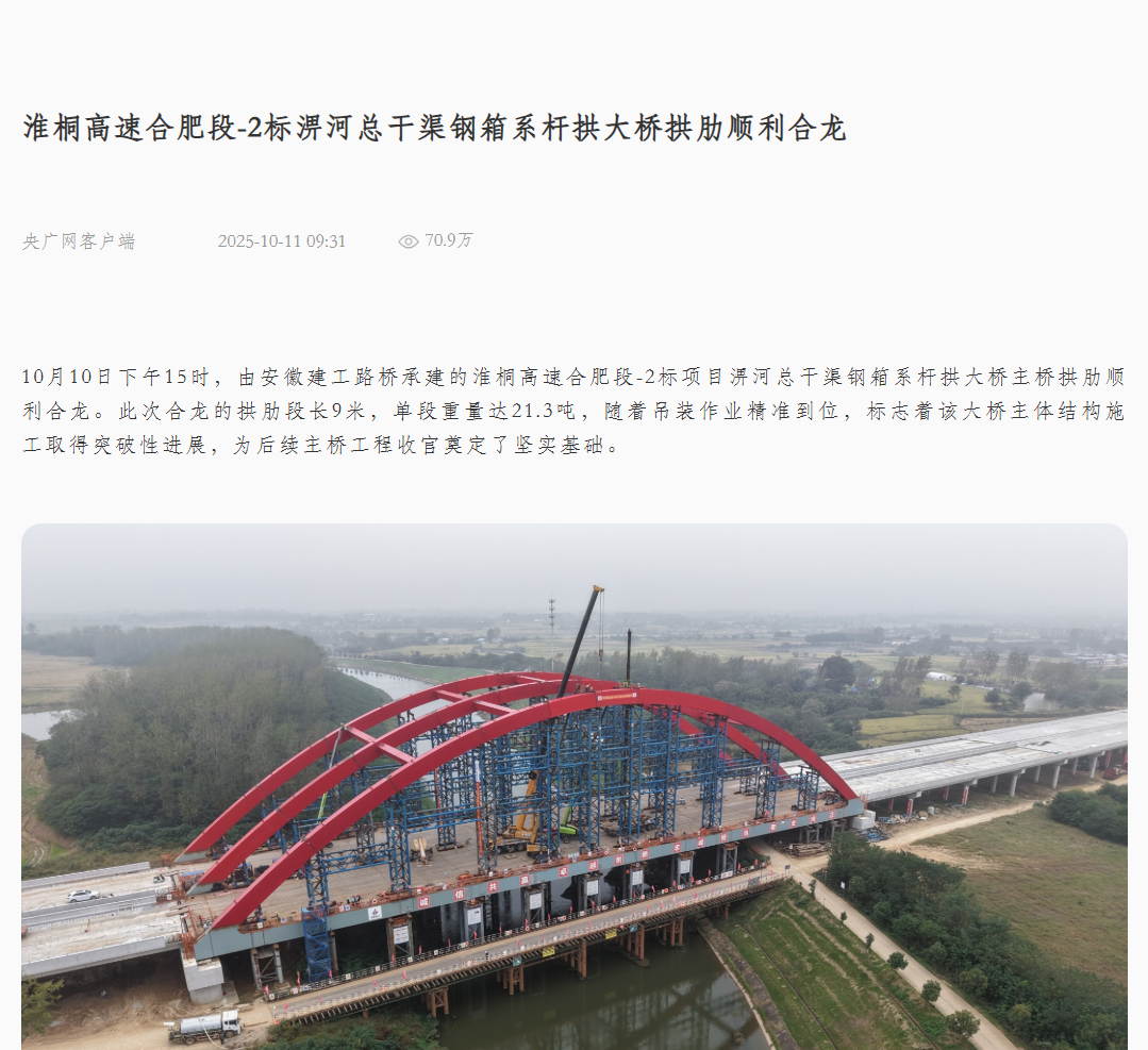 近日,央廣網(wǎng)、安徽日報(bào)、安徽交通運(yùn)輸、大皖新聞等主流媒體聚焦報(bào)道淮桐高速合肥段路基2標(biāo)淠河總干渠大橋拱肋合龍。
