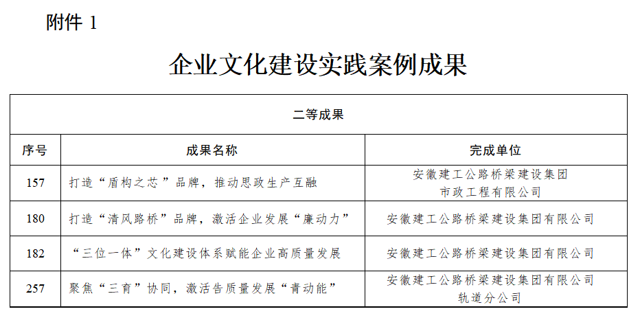 近日,中國(guó)施工企業(yè)管理協(xié)會(huì)發(fā)布2025年企業(yè)文化建設(shè)實(shí)踐案例成果,公司選送的案例《打造“盾構(gòu)之芯”品牌,推動(dòng)思政生產(chǎn)互融”》《打造“清風(fēng)路橋”品牌,激活企業(yè)發(fā)展“廉動(dòng)力”》《“三位一體”文化建設(shè)體系賦能企業(yè)高質(zhì)量發(fā)展》《聚焦“三育”協(xié)同,激活高質(zhì)量發(fā)展“青動(dòng)能”》,從全國(guó)1000余個(gè)參評(píng)案例中脫穎而出,成功入選企業(yè)文化建設(shè)實(shí)踐案例二等成果,充分展現(xiàn)了公司多年來在企業(yè)文化建設(shè)方面的累累碩果。