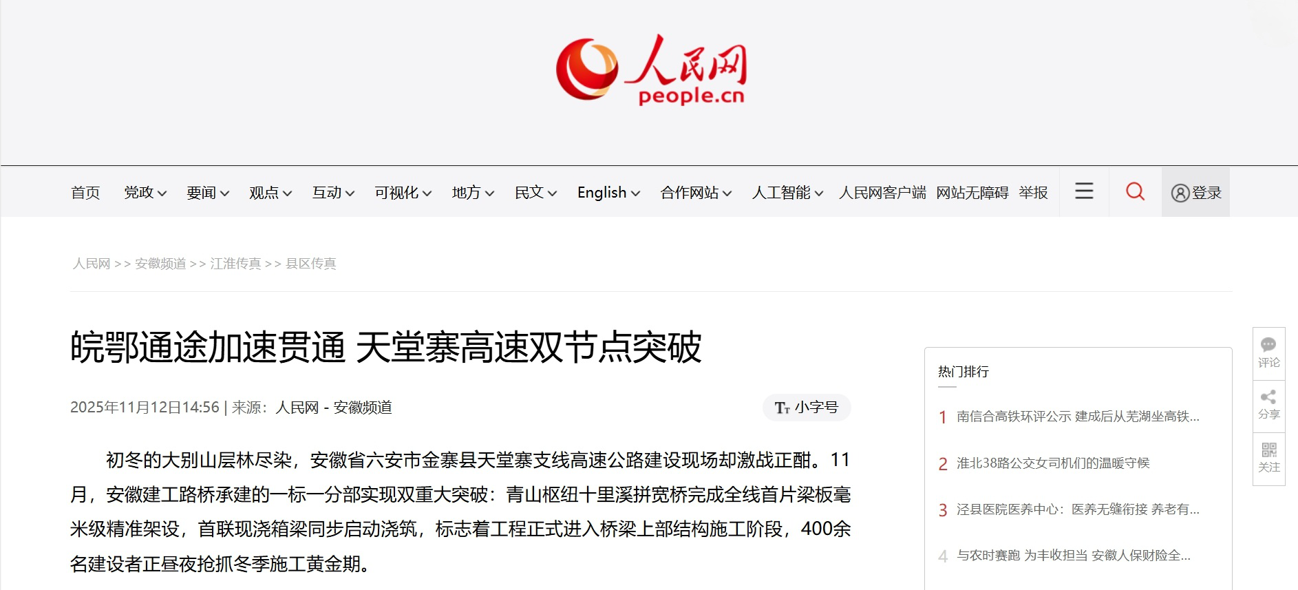 【名媒聚焦】人民網(wǎng)安徽頻道:皖鄂通途加速貫通 天堂寨高速雙節(jié)點(diǎn)突破