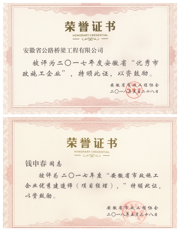 安徽省“優(yōu)秀市政施工企業(yè)”是安徽省市政行業(yè)企業(yè)管理的最高獎(jiǎng),獲獎(jiǎng)企業(yè)經(jīng)濟(jì)指標(biāo)、社會(huì)效益良好,質(zhì)量管理、安全管理、科技進(jìn)步、誠(chéng)信體系建設(shè)等方面取得實(shí)效。
